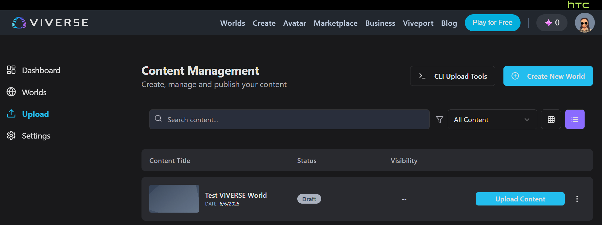 1. Go to the Upload section in the sidebar to open the "Manage Content" page in VIVERSE Studio.\\