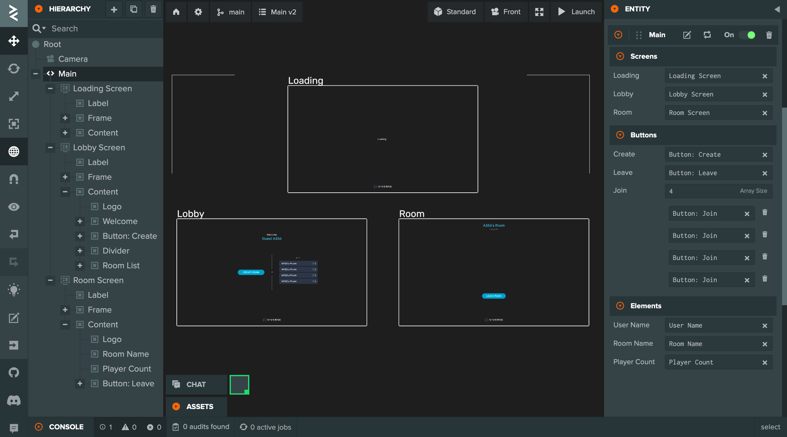 * Similar to Screens, we've grouped new UI functionality into Buttons and Elements, and linked respective entities to corresponding Script Attributes. Also note that we're using array of Entities for Join button since we're going to have multiple of them in our Lobby