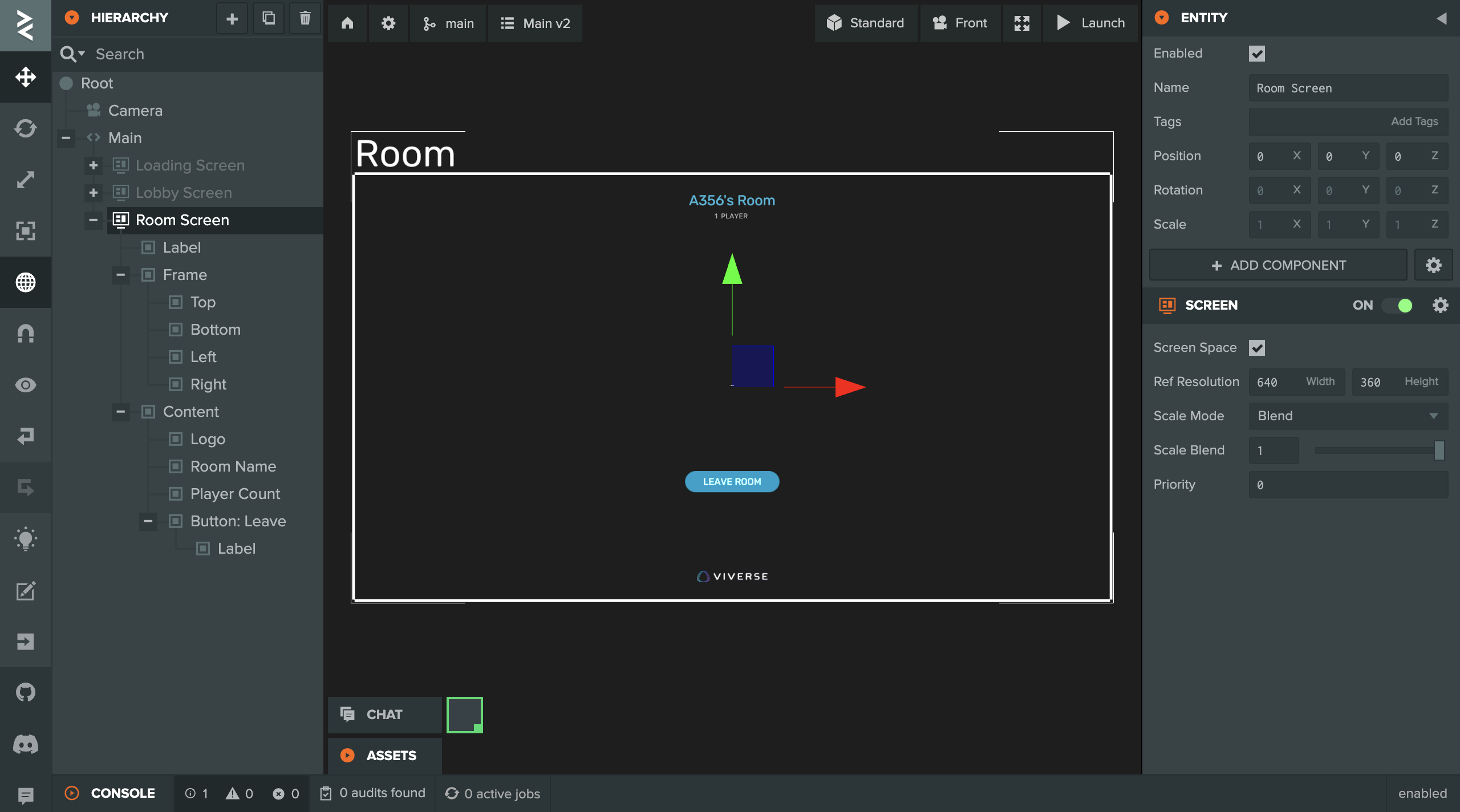 * **Room Screen**: Room Name text, Player Count text and Leave button